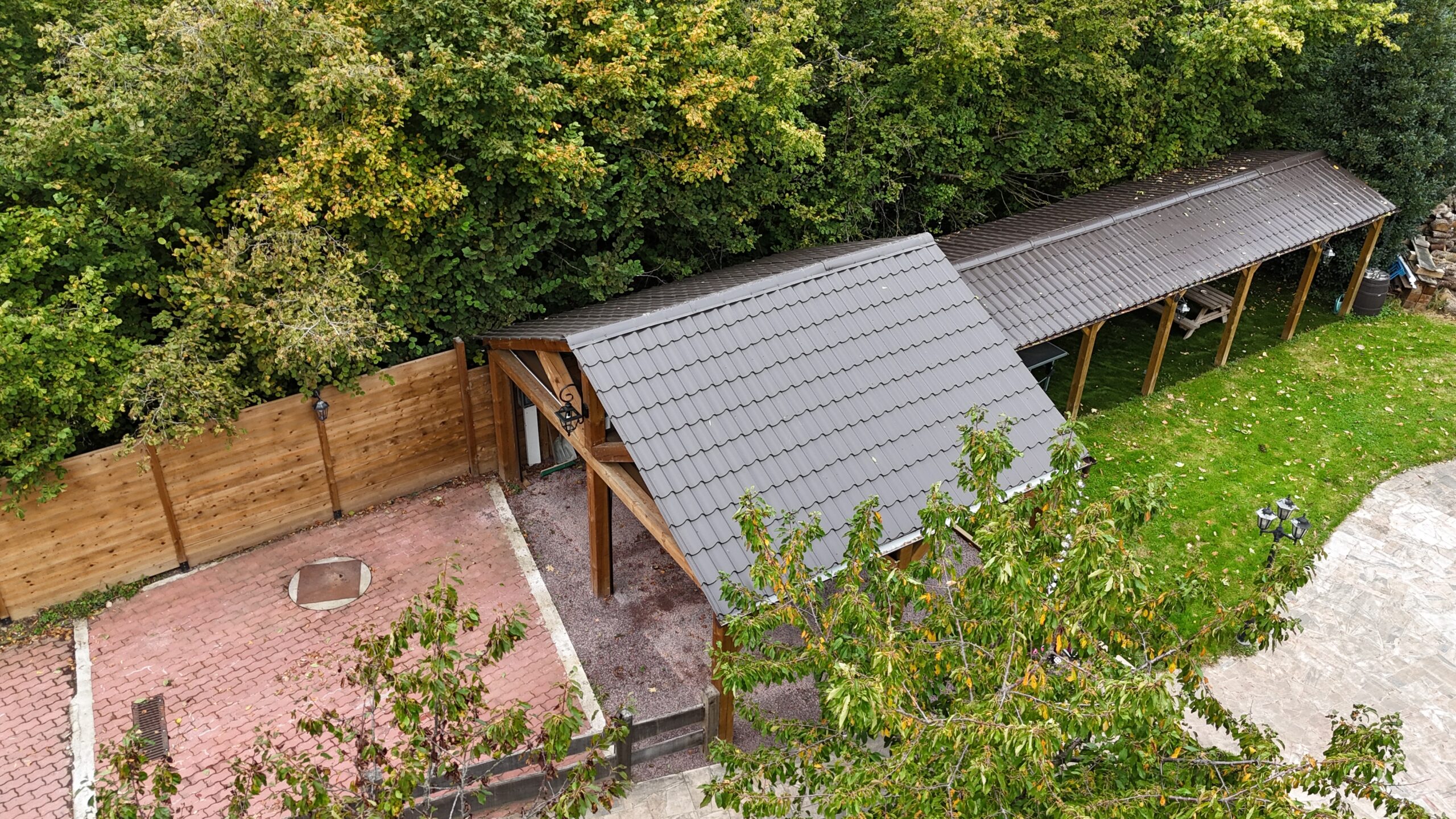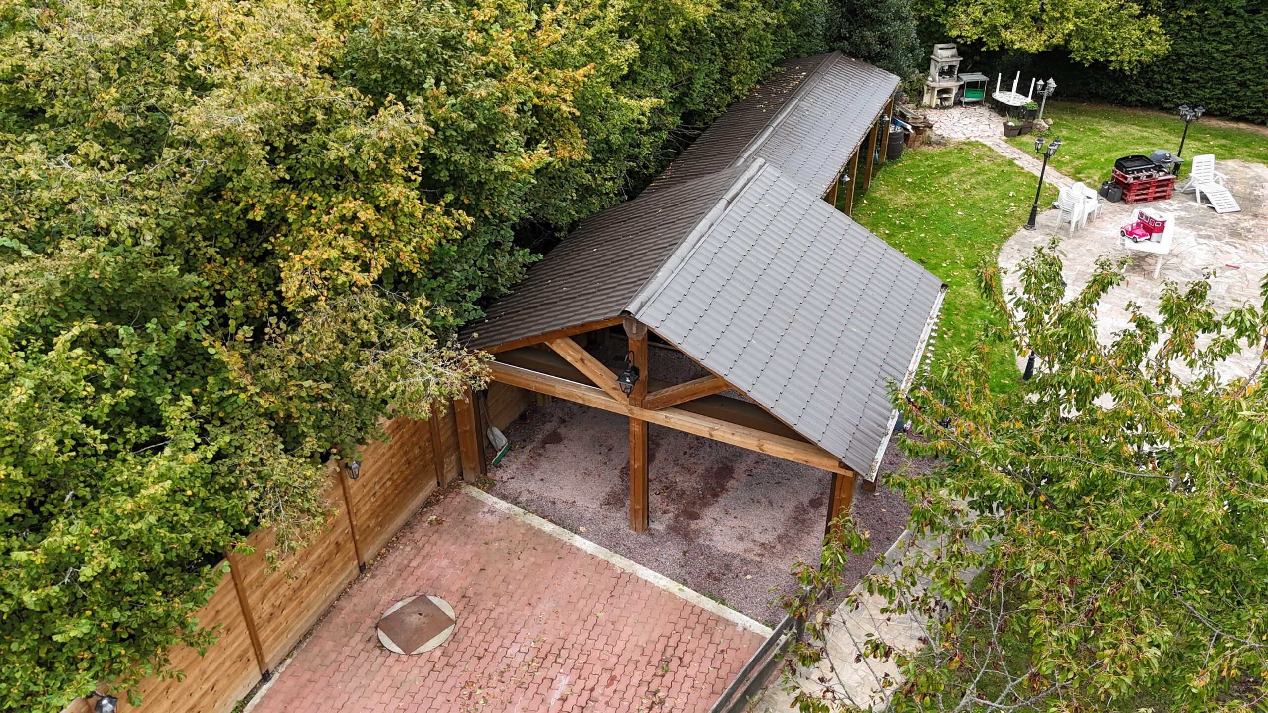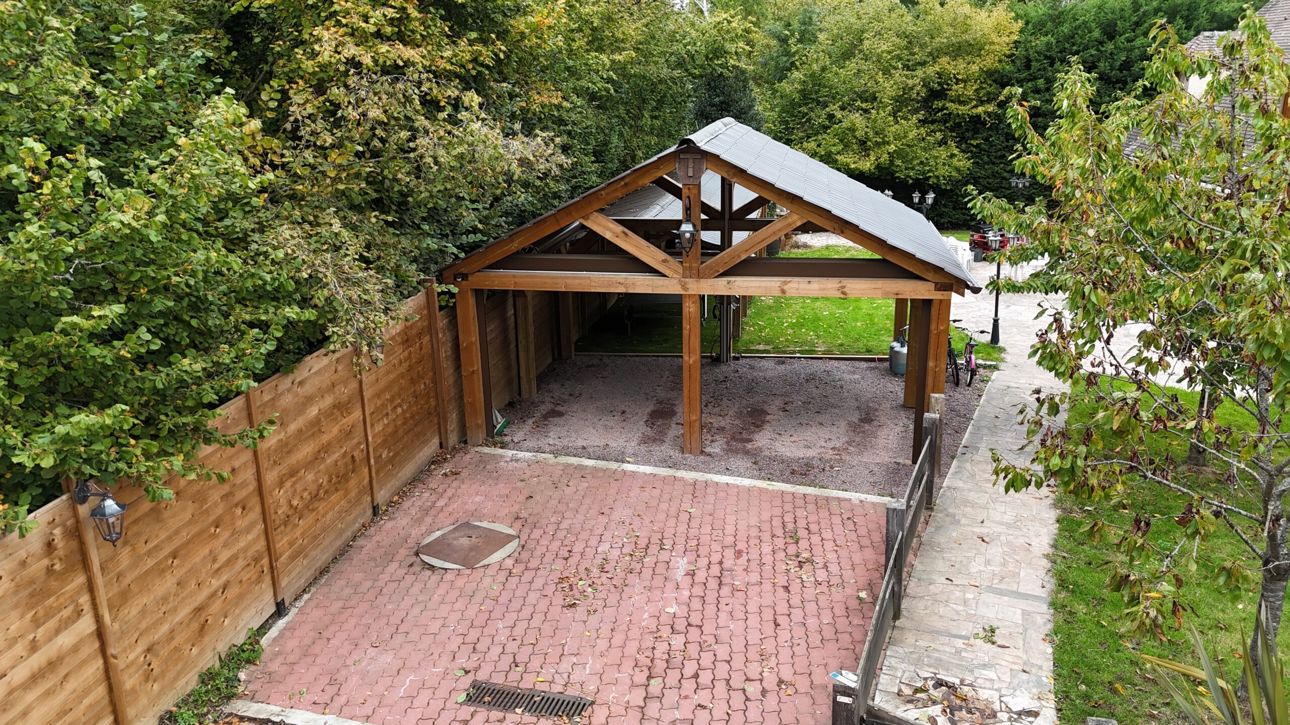 La première partie du carport permet d’abriter deux véhicules, offrant une protection efficace contre les intempéries tout en conservant un style chaleureux et naturel grâce à la structure en pin.