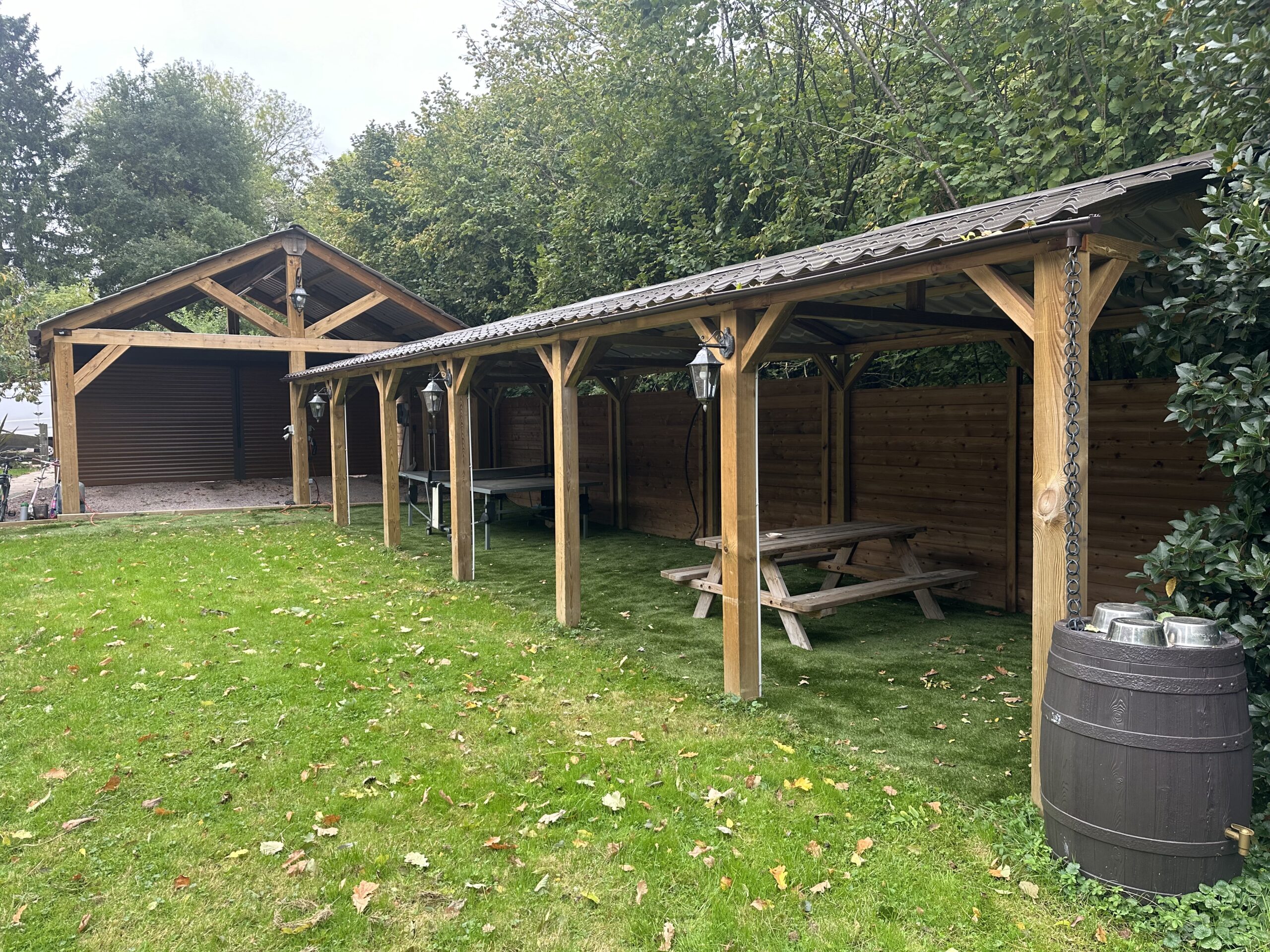Des lampes à l’ancienne ont été installées sur la structure du carport et la palissade en pin attenante. Elles ajoutent une touche décorative et apportent une ambiance chaleureuse en soirée, tout en soulignant le charme du bois.
