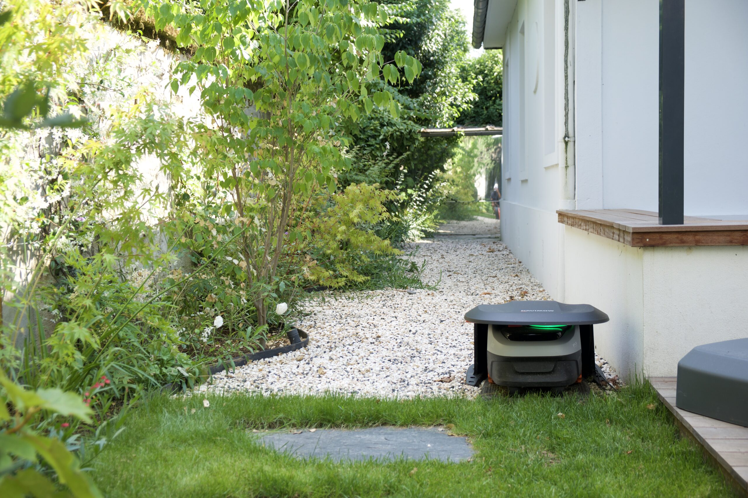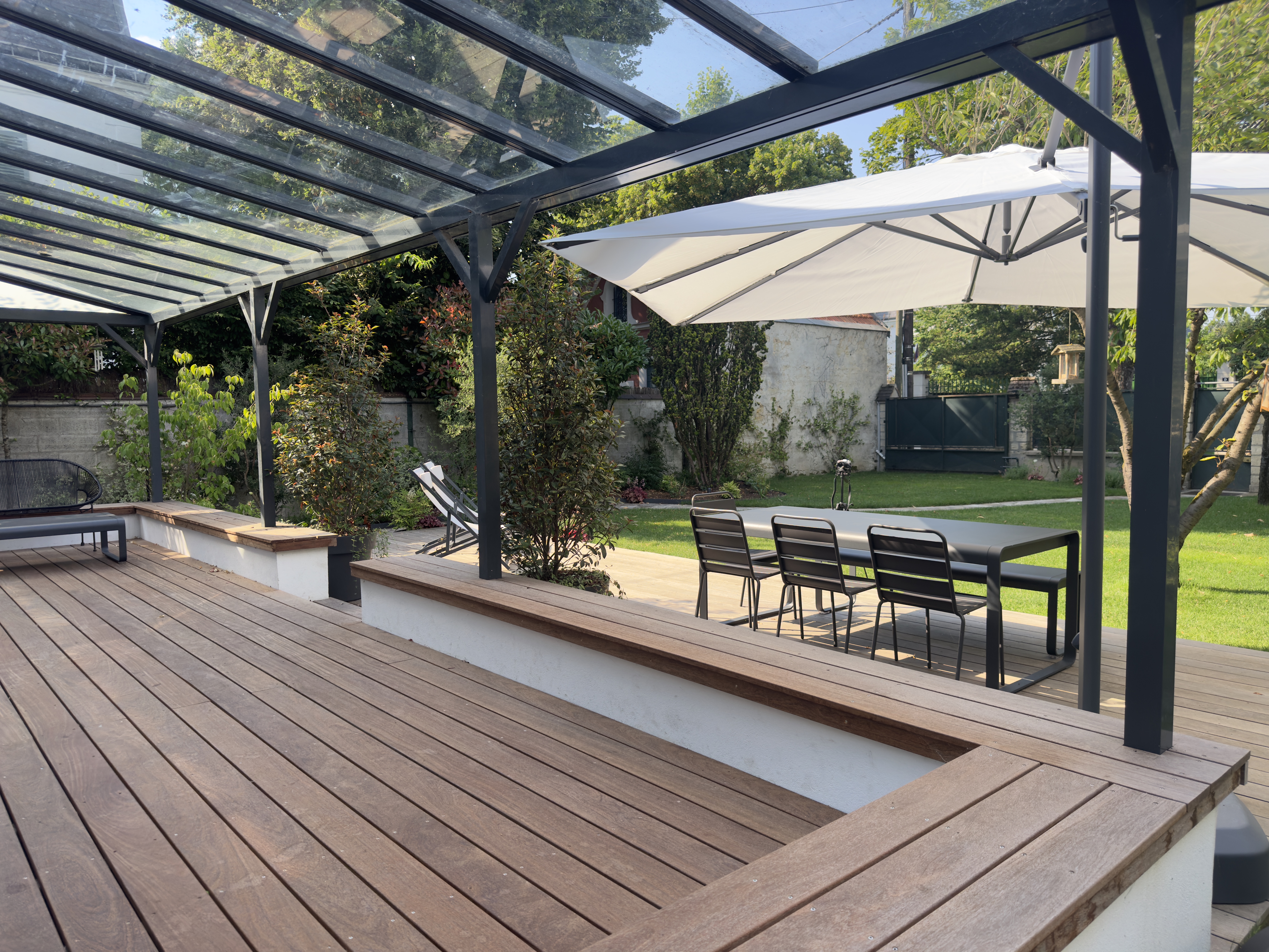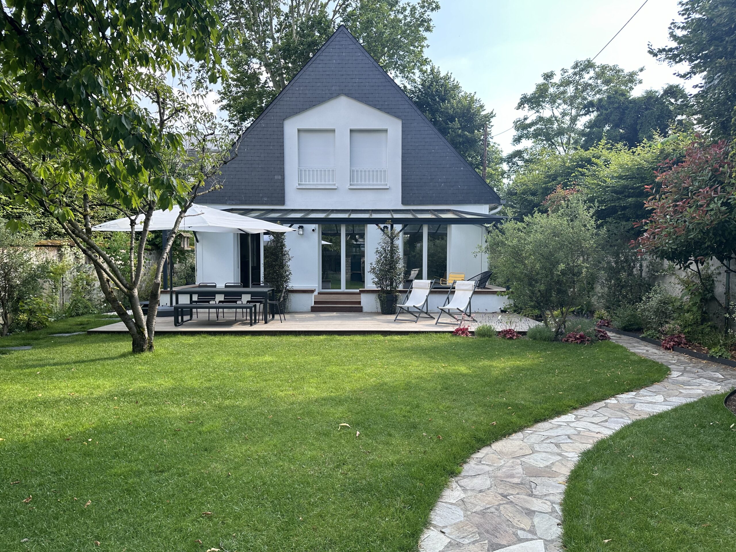 Après réaménagement, le jardin est devenu un véritable espace de vie extérieur. Le chemin en pierres a été redessiné pour offrir une circulation fluide et agréable, bordé de plantes soigneusement choisies. La terrasse en bois, moderne et élégante, crée un véritable coin de détente, avec du mobilier confortable pour profiter des beaux jours.